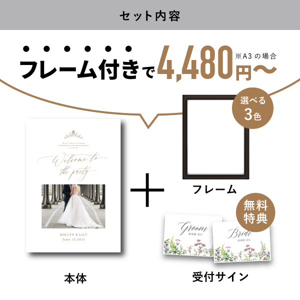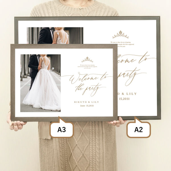| 内容物 | フォトウェルカムボード ■フレーム付き(A3サイズは3種類よりお選びいただけます。A2サイズは2種類よりお選びいただけます。) |