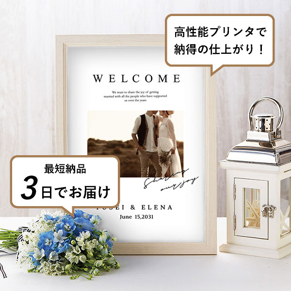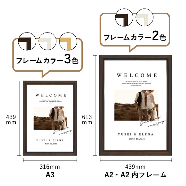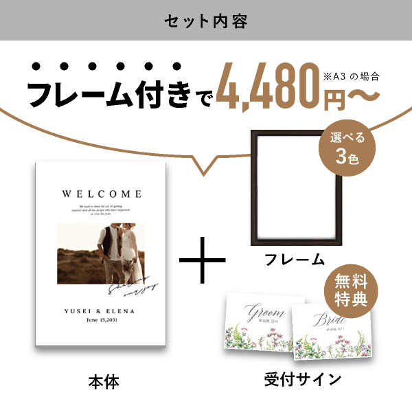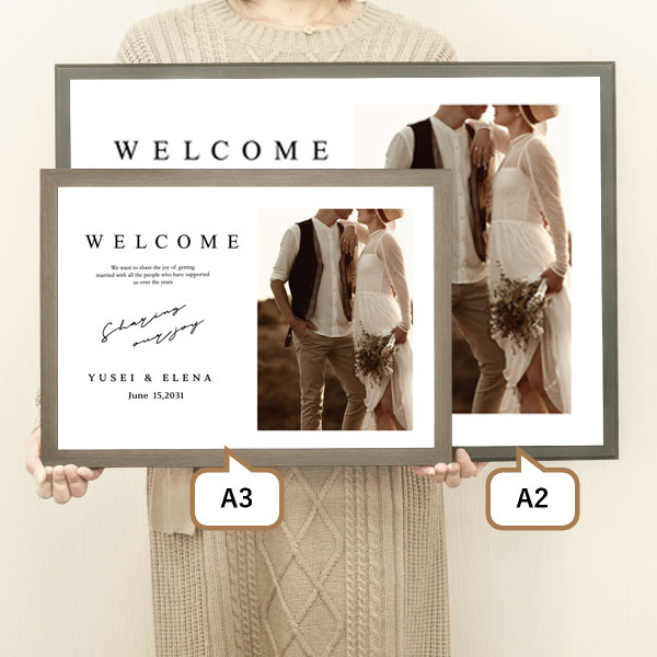 | 内容物 | フォトウェルカムボード ■フレーム付き(A3サイズは3種類よりお選びいただけます。A2サイズは2種類よりお選びいただけます。) |