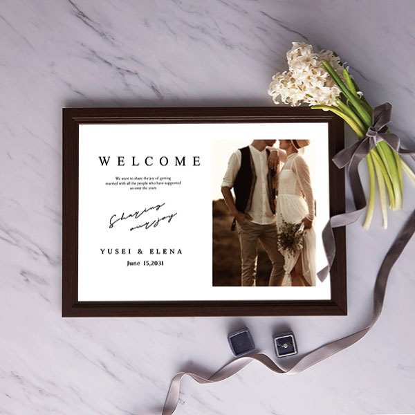 光る、輝く、透き通ったを意味する「Lucent-ルーセント-」。スタイリッシュなデザインにおふたりの前撮り写真や思い出写真をのせることでおふたりの未来が輝かしくスタートできそう。背景をあえて白色にし余白を魅せることによってセンス溢れるウェルカムボードになります。どんなトレンドにも対応できるデザインだからこそウェルカムスペースを考えるのが楽しくなります。