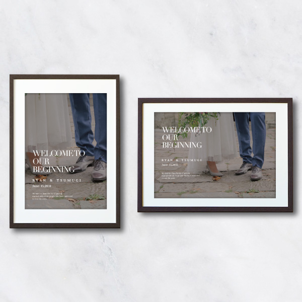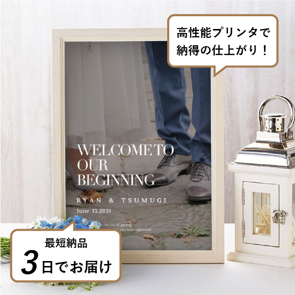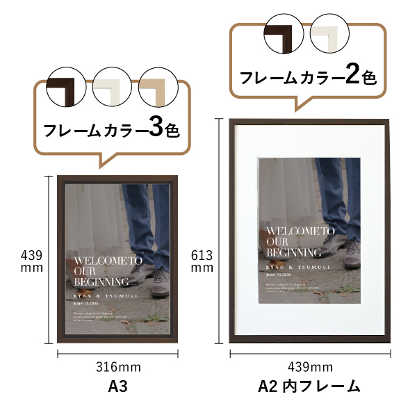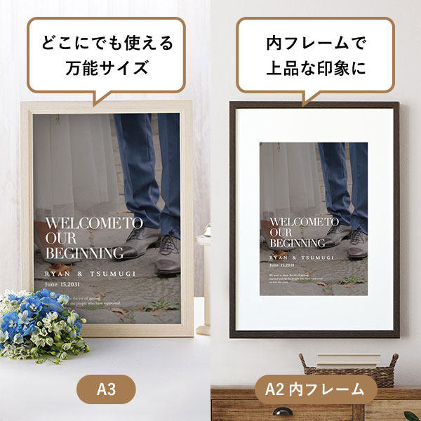 | 内容物 | フォトウェルカムボード ■スタイリッシュボード(厚さ7mmのボードに、フチを裁断したスタイリッシュな仕上がりです。) ■フレーム付き(A3サイズは3種類よりお選びいただけます。A2サイズは2種類よりお選びいただけます。) |