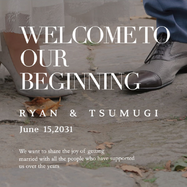 光る、輝く、透き通ったを意味する「Lucent-ルーセント-」。スタイリッシュなデザインにおふたりの前撮り写真や思い出写真をのせることでおふたりの未来が輝かしくスタートできそう。黒いフィルター加工を使用することによってヴィンテージ感出し透明感を演出。文字も白文字で字体が見やすくおふたりのお写真にも映えます。おふたりのお名前と挙式のお日にちを入れ特別な1枚に仕上げます。