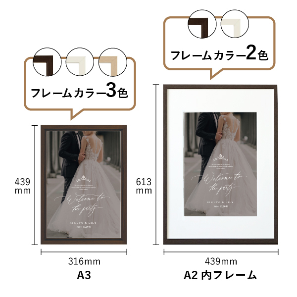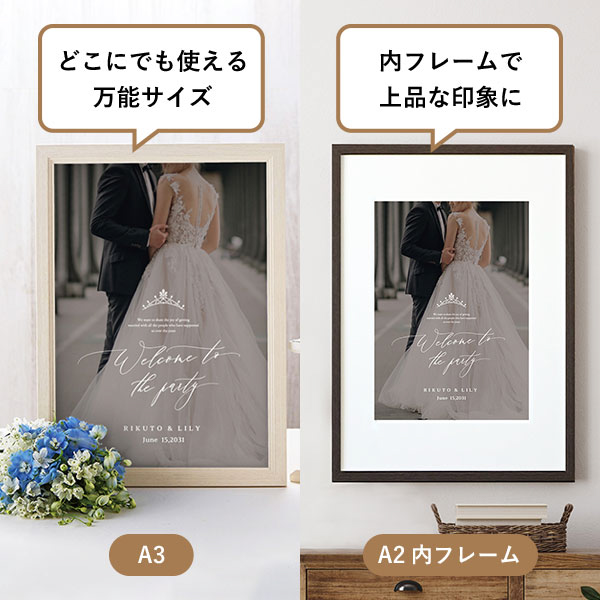| 内容物 | フォトウェルカムボード ■スタイリッシュボード(厚さ7mmのボードに、フチを裁断したスタイリッシュな仕上がりです。) ■フレーム付き(A3サイズは3種類よりお選びいただけます。A2サイズは2種類よりお選びいただけます。) |