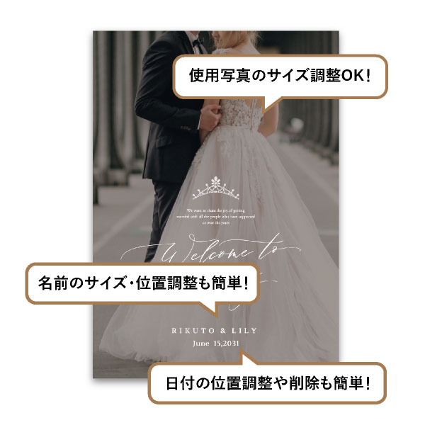 光る、輝く、透き通ったを意味する「Lucent-ルーセント-」。スタイリッシュなデザインにおふたりの前撮り写真や思い出写真をのせることでおふたりの未来が輝かしくスタートできそう。ティアラは、結婚するおふたりから星空の神様へ、『永遠の愛を誓う』とってもロマンチックな由来があります。シンプルだけど華やかさを表現し、結婚式にぴったりなウェルカムボードになります。