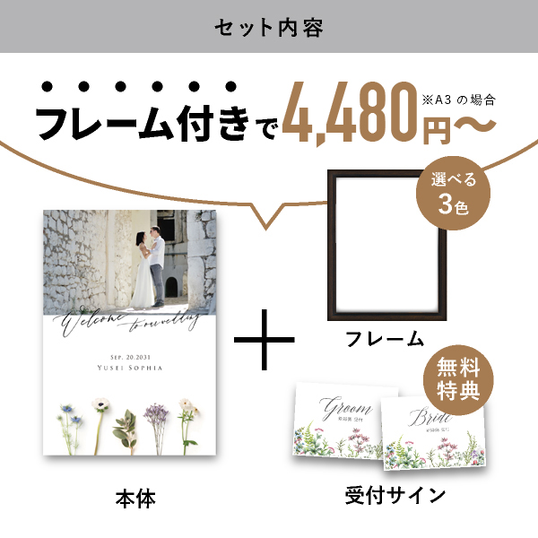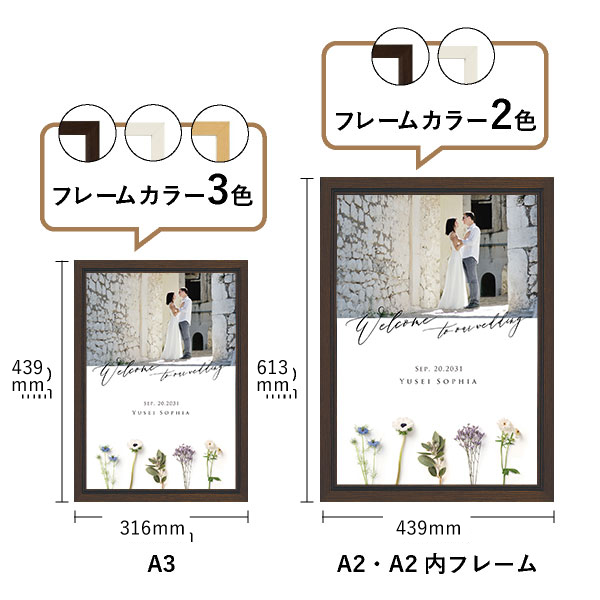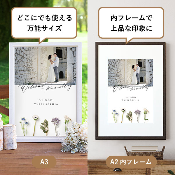 | 内容物 | フォトウェルカムボード ■フレーム付き(A3サイズは3種類よりお選びいただけます。A2サイズは2種類よりお選びいただけます。) |