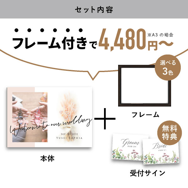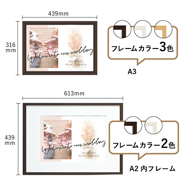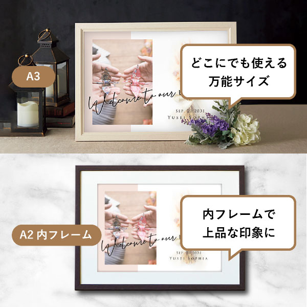 | 内容物 | フォトウェルカムボード ■フレーム付き(A3サイズは3種類よりお選びいただけます。A2サイズは2種類よりお選びいただけます。) |