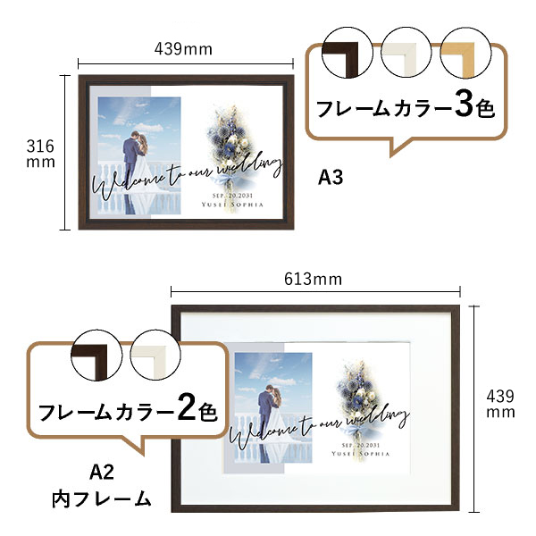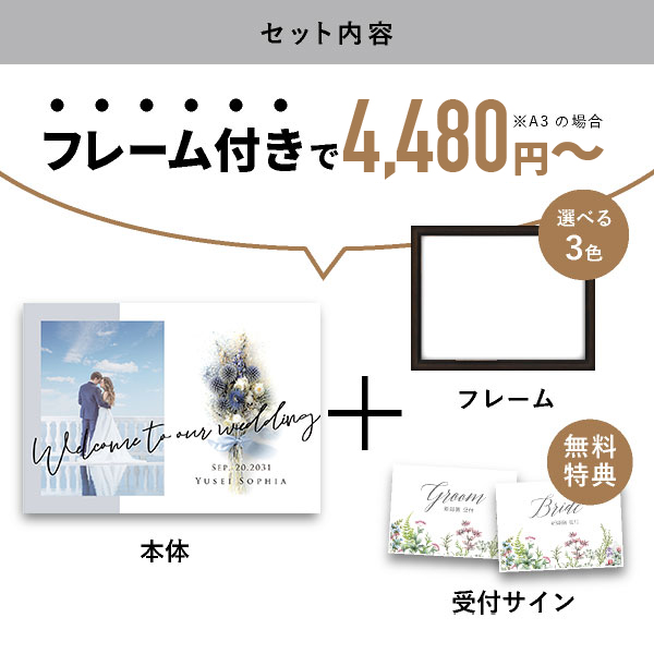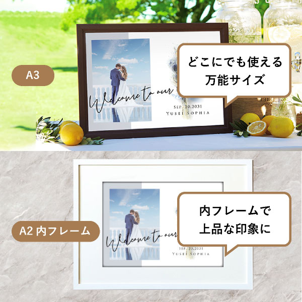 | 内容物 | フォトウェルカムボード ■フレーム付き(A3サイズは3種類よりお選びいただけます。A2サイズは2種類よりお選びいただけます。) |