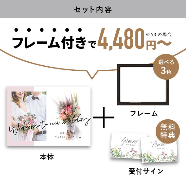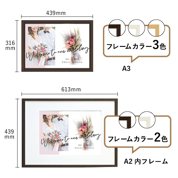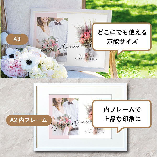 | 内容物 | フォトウェルカムボード ■フレーム付き(A3サイズは3種類よりお選びいただけます。A2サイズは2種類よりお選びいただけます。) |