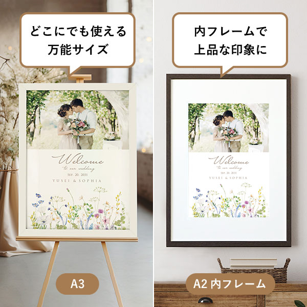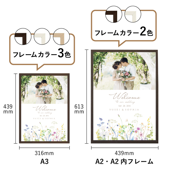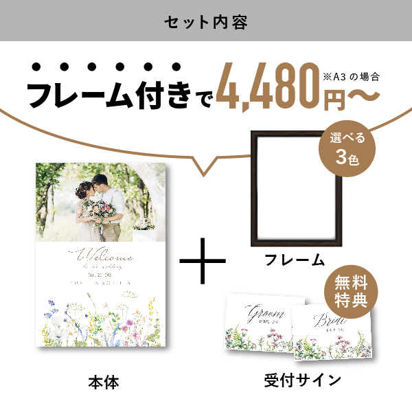 | 内容物 | フォトウェルカムボード ■フレーム付き(A3サイズは3種類よりお選びいただけます。A2サイズはダークブラウン・ホワイトの2種類よりお選びいただけます。) ■フレーム付き(A3サイズは3種類よりお選びいただけます。A2サイズは2種類よりお選びいただけます。) |