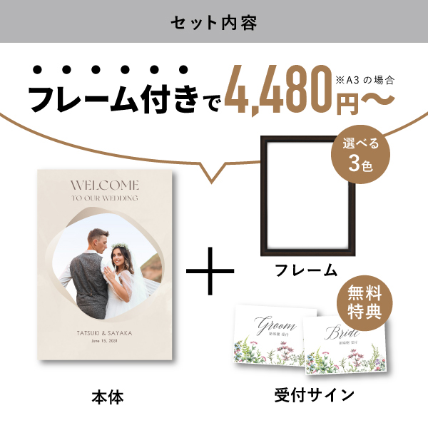| 無料特典 | 受付サイン1組(新郎用×1組、新婦用×1組) |