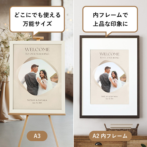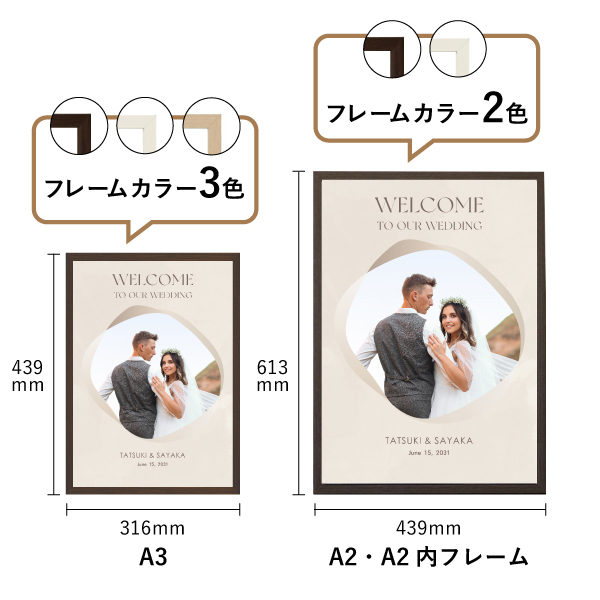 | 内容物 | フォトウェルカムボード ■フレーム付き(A3サイズは3種類よりお選びいただけます。A2サイズはダークブラウン・ホワイトの2種類よりお選びいただけます。) ■フレーム付き(A3サイズは3種類よりお選びいただけます。A2サイズは2種類よりお選びいただけます。) |