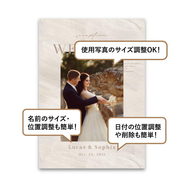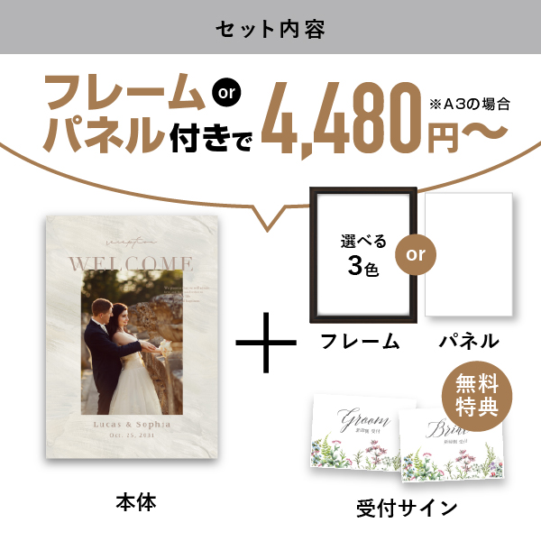 | 無料特典 | 受付サイン1組(新郎用×1組、新婦用×1組) |