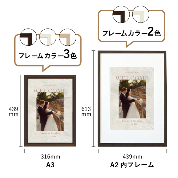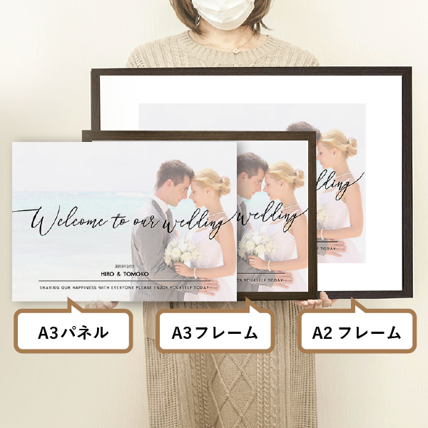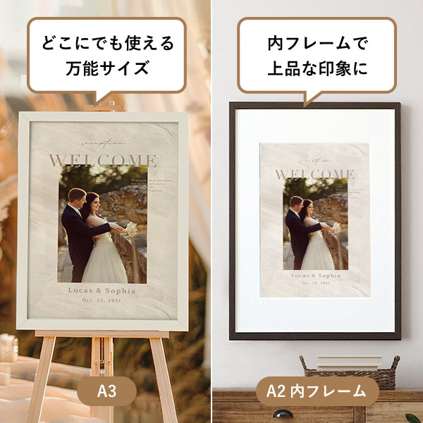 | 内容物 | フォトウェルカムボード ■フレーム付き(A3サイズは3種類よりお選びいただけます。A2サイズはダークブラウン・ホワイトの2種類よりお選びいただけます。) ■スタイリッシュボード(厚さ7mmのボードに、フチを裁断したスタイリッシュな仕上がりです。) ■フレーム付き(A3サイズは3種類よりお選びいただけます。A2サイズは2種類よりお選びいただけます。) |