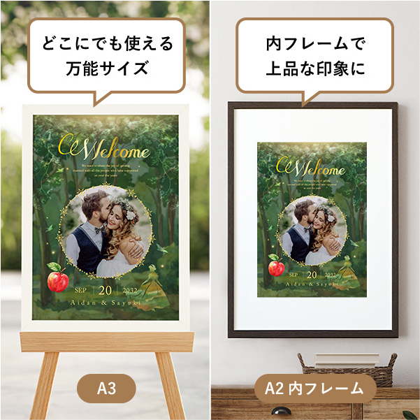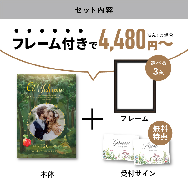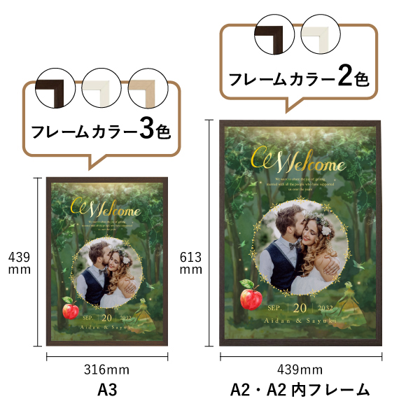 | 内容物 | フォトウェルカムボード ■フレーム付き(A3サイズは3種類よりお選びいただけます。A2サイズはダークブラウン・ホワイトの2種類よりお選びいただけます。) ■フレーム付き(A3サイズは3種類よりお選びいただけます。A2サイズは2種類よりお選びいただけます。) |