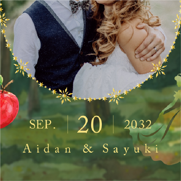 「世界で最も美しい人」の花言葉をもつりんごのモチーフと魔法から目覚める愛のキスをイメージした「reveiller kiss -レヴェイエ・キス-」。可憐に舞う小鳥と植物の繊細なシルエットと深い森の中をイメージしたグリーンカラーは、おふたりの純粋で真っすぐな美しい心を象徴するかのよう。これから結婚式を挙げるおふたりの美しく寄り添う一瞬を重ねることで、おふたりの未来がどんな時も力強く輝き、愛と幸せに満ちたものになるよう願いを込めました。輝く未来への扉をひらくプリンセスウェディングにぴったりです。