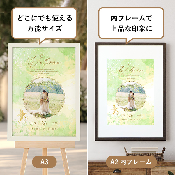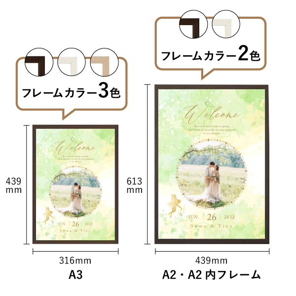 | 内容物 | フォトウェルカムボード ■フレーム付き(A3サイズは3種類よりお選びいただけます。A2サイズはダークブラウン・ホワイトの2種類よりお選びいただけます。) ■フレーム付き(A3サイズは3種類よりお選びいただけます。A2サイズは2種類よりお選びいただけます。) |