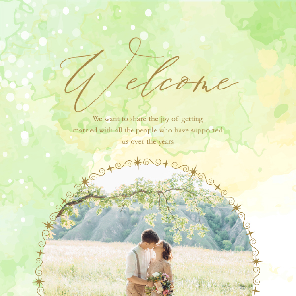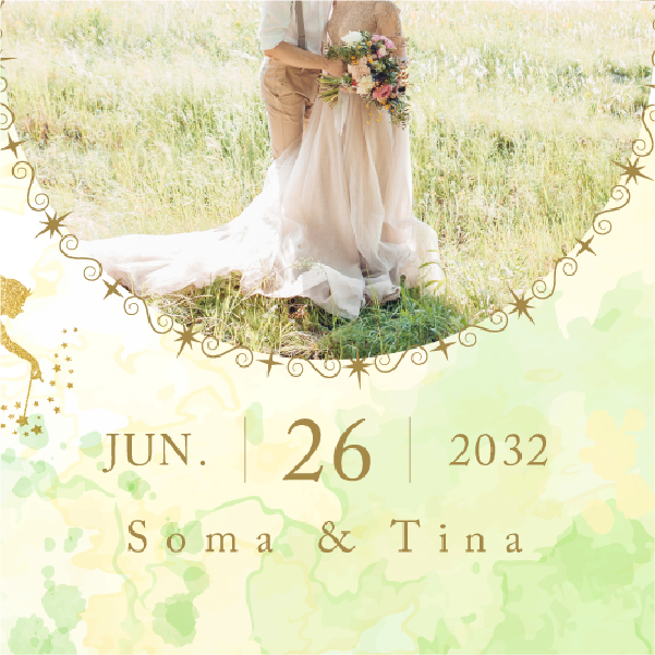 キラキラと輝く金の粉をまきながら可憐に舞う美しい妖精の世界観がファンタジックな「Fairlit -フェアリット-」。キラキラ輝く妖精のシルエットと淡いイエロー×グリーンの爽やかでナチュラルなパステルカラーは、明るく純粋な心をもつチャーミングなおふたりを象徴しているよう。これから結婚式を挙げるおふたりの可憐に寄り添う一瞬を重ねることで、おふたりの未来がどんな時も力強く輝き、愛と幸せに満ちたものになるよう願いを込めました。輝く未来への扉をひらくプリンセスウェディングにぴったりです。
