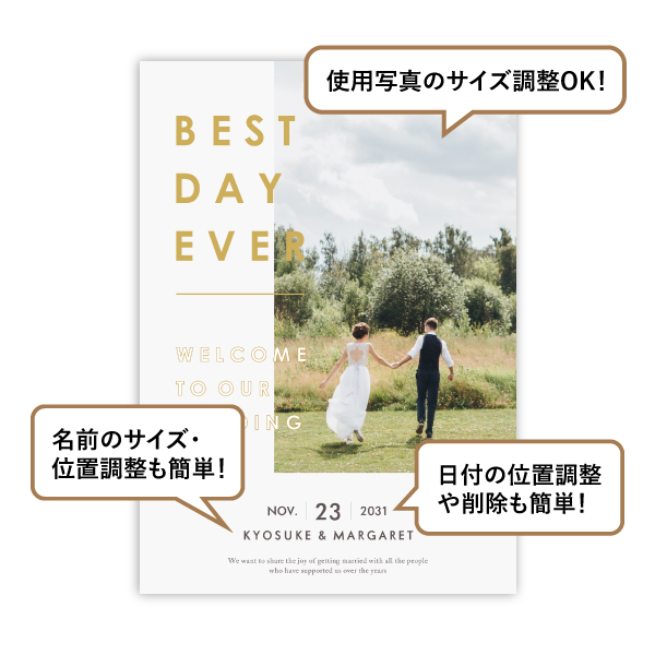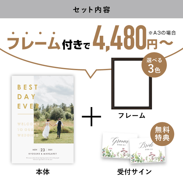 | 無料特典 | 受付サイン1組(新郎用×1組、新婦用×1組) |