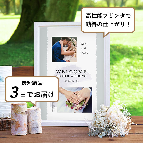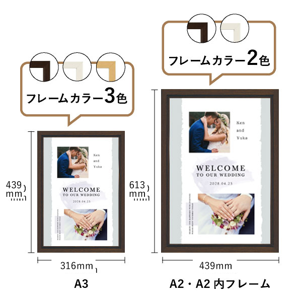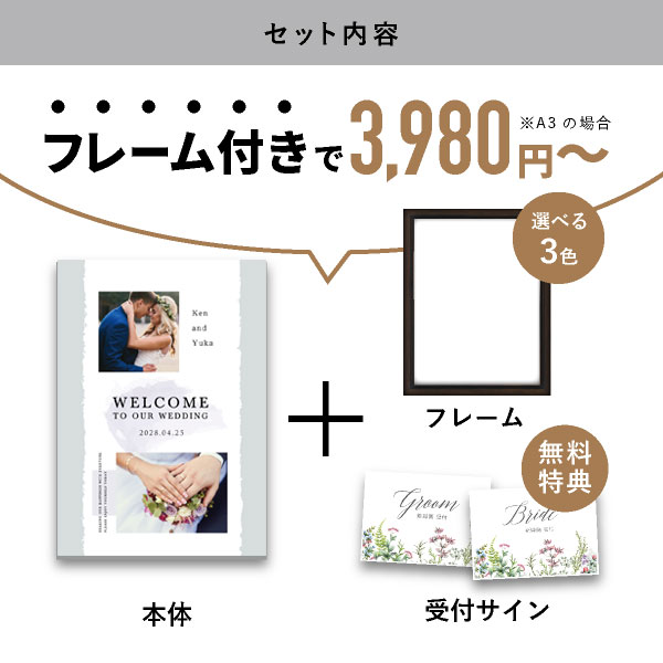 | 内容物 | フォトウェルカムボード ■フレーム付き(A3サイズは3種類よりお選びいただけます。A2サイズは2種類よりお選びいただけます。) |