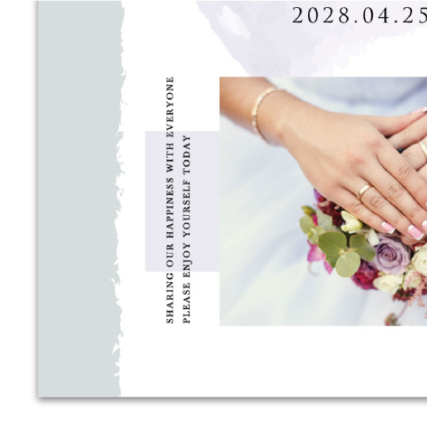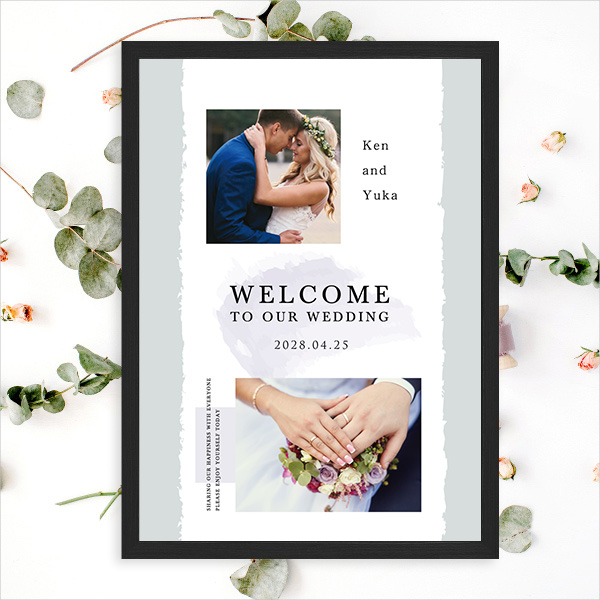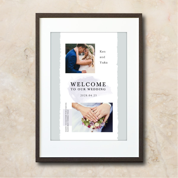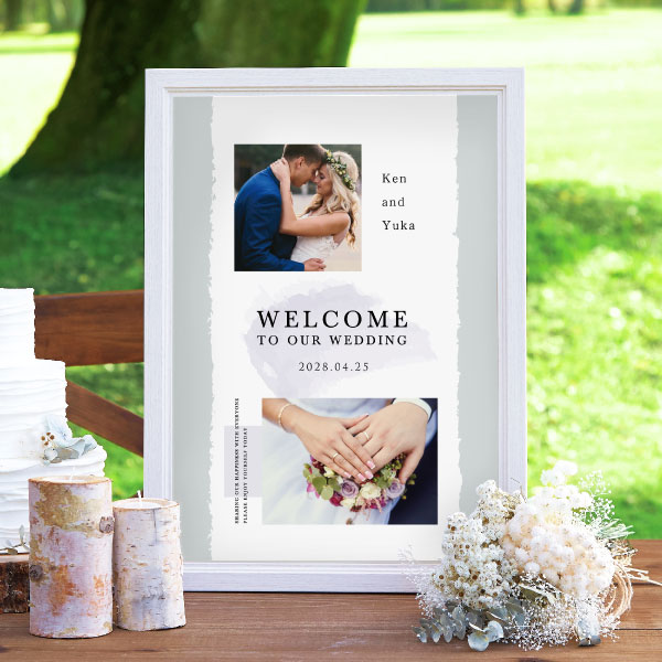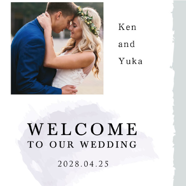 淡く水彩インクをあしらったカジュアルで、爽やかに漂うリラックスウェディングを演出。柔らかな色調が心地よく、クールで大人な印象を感じるデザイン。おふたりらしい雰囲気のウェルカムボードにゲストの方も笑顔があふれるはず。すっきりとシンプルなデザインなのでどんなウェルカムスペースにも合います◎