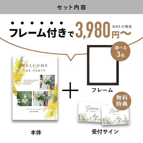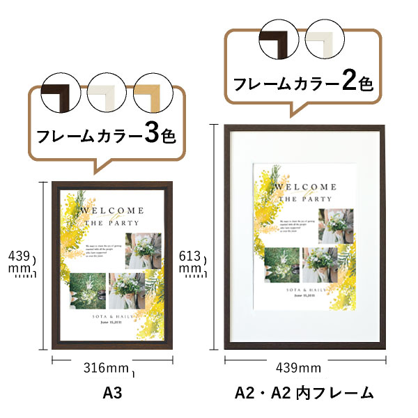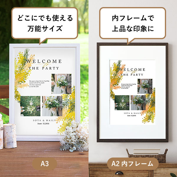 | 内容物 | フォトウェルカムボード ■フレーム付き(A3サイズは3種類よりお選びいただけます。A2サイズは2種類よりお選びいただけます。) |