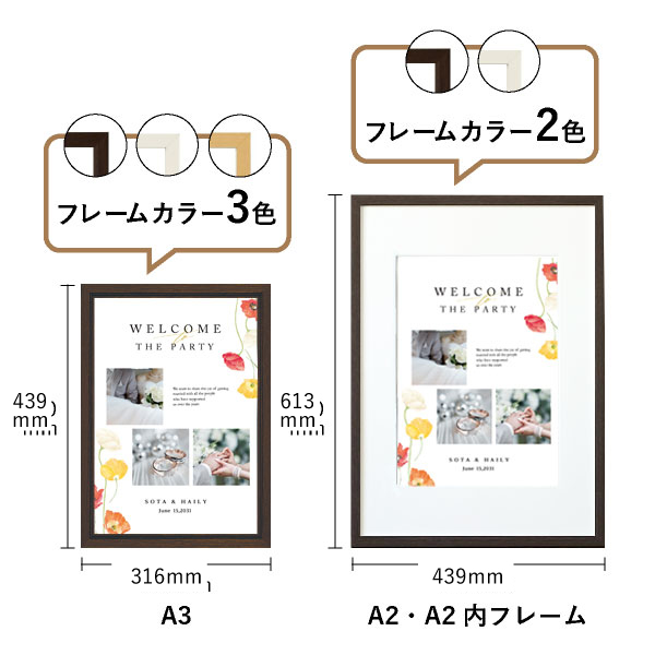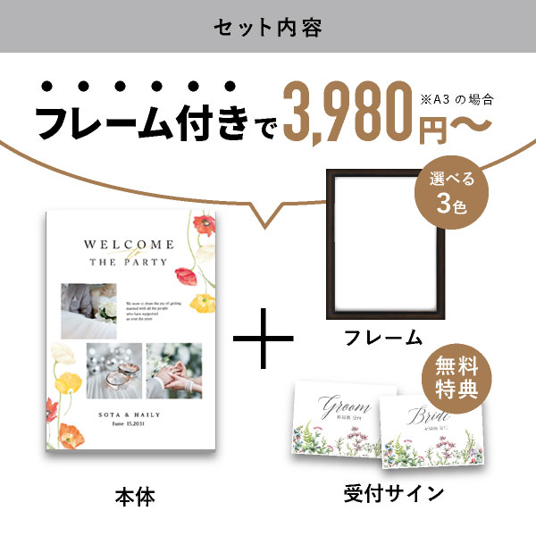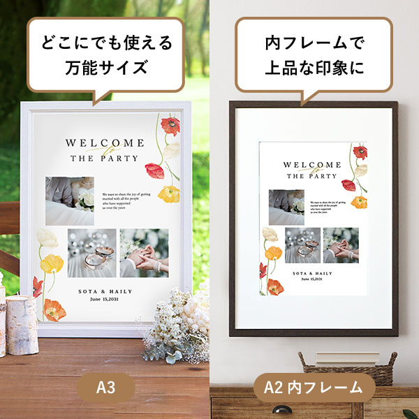 | 内容物 | フォトウェルカムボード ■フレーム付き(A3サイズは3種類よりお選びいただけます。A2サイズは2種類よりお選びいただけます。) |