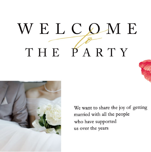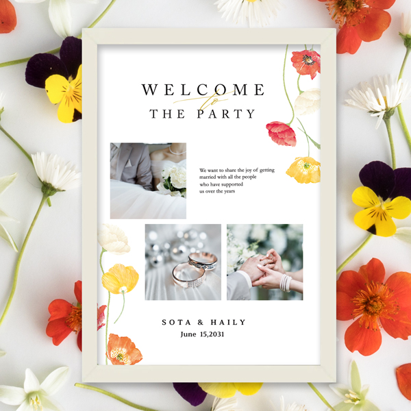 淡く水彩で描かれたポピーの花が、可愛らしくウェルカムスペースを演出。優しくやわらかな色調で、参加されるゲスト様が温かく二人の幸せな姿を最初に見るボードになっています。使いたい写真がたくさんある人におすすめのカジュアルなウェルカムボードになっています!