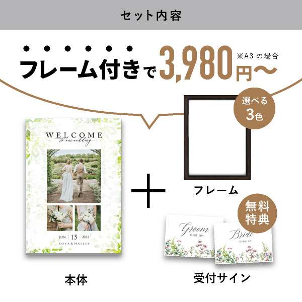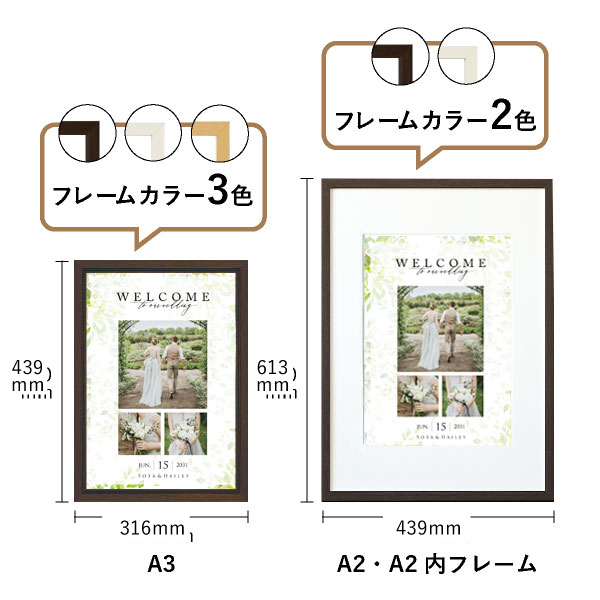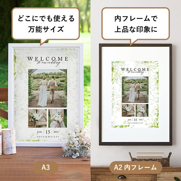 | 内容物 | フォトウェルカムボード ■フレーム付き(A3サイズは3種類よりお選びいただけます。A2サイズは2種類よりお選びいただけます。) |
