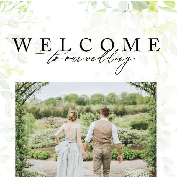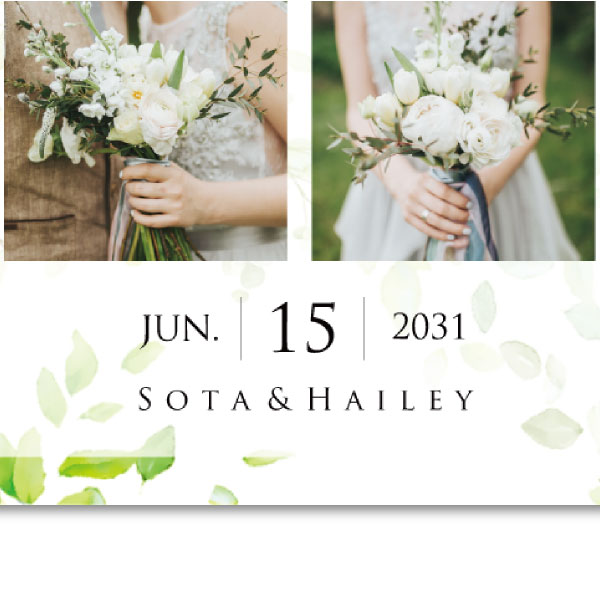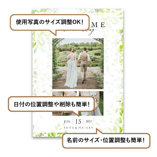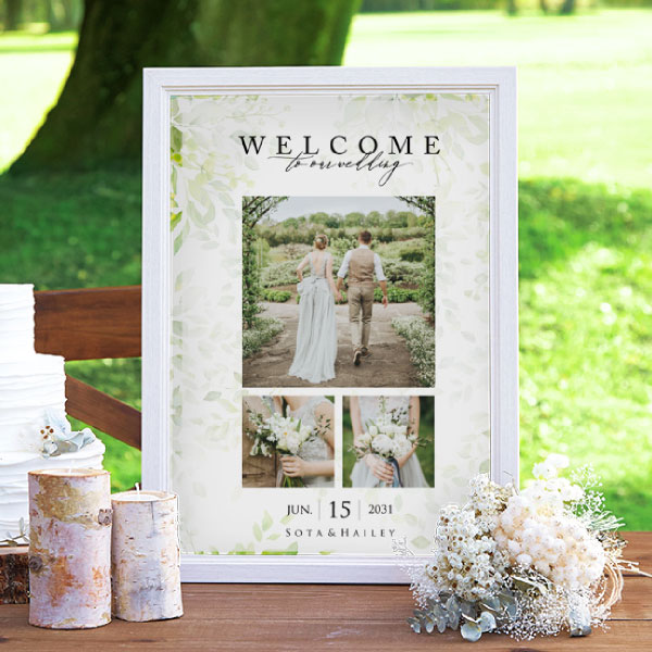 ナチュラルウェディング・ガーデンウェディングなどにぴったり!鮮やかなグリーンが優しいおふたりの雰囲気と印象演出してくれます。さらに、複数枚写真を使用したい方におすすめの3枚使用できるレイアウト!おふたりの幸せな写真と洗練された雰囲気でゲストをお出迎えしてみてはいかがでしょうか?