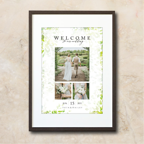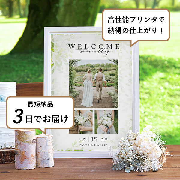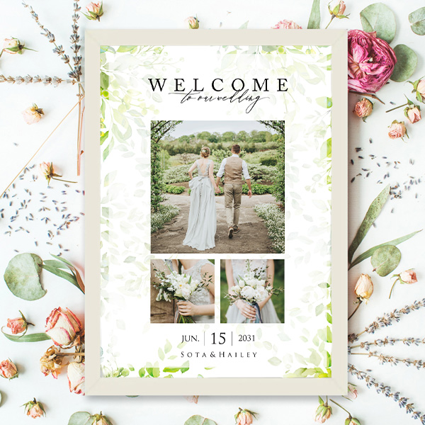 縦型のものを注文し、キャンペーン期間中でもう1枚も作っていただくことができました。縦型は式のテーマに合わせてボタニカルなものでナチュラルに、もう1枚は横型にし、名前なども漢字で入れられるテイストの違うものを選びました。おかげで、前撮りで撮ったドレスと和装のどちらも写真で使うことができ、ウェルカムスペースに飾ることができました。おまけで受付のカードも選べ、大変満足しています。丁寧に迅速に対応して頂きありがとうございました。