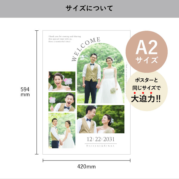 おふたりの代わりにゲストをお出迎えするウェルカムボードは、大きいほど存在感があり、見ごたえバツグン!A2サイズはポスターと同じ大きさで、A3サイズと比べても圧倒的な迫力!遠くからでもゲストの目を引きます◎