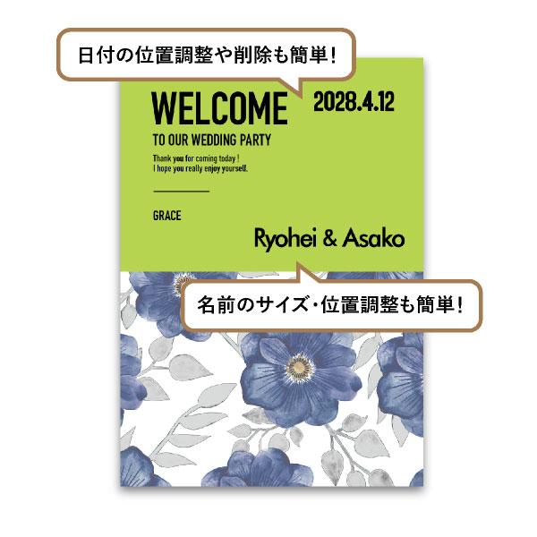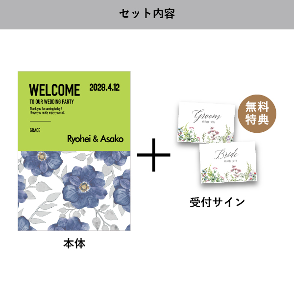 | 無料特典 | 受付サイン1組(新郎用×1組、新婦用×1組) |