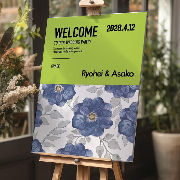 大きく描かれたフラワーとPOPなカラーが特徴的な一枚。優しさ、清らかさ、癒しを感じさせるナチュラルな空間を演出。ブルーのフラワーがおしゃれなウェルカムボードで、ゲストをお迎えしましょう!