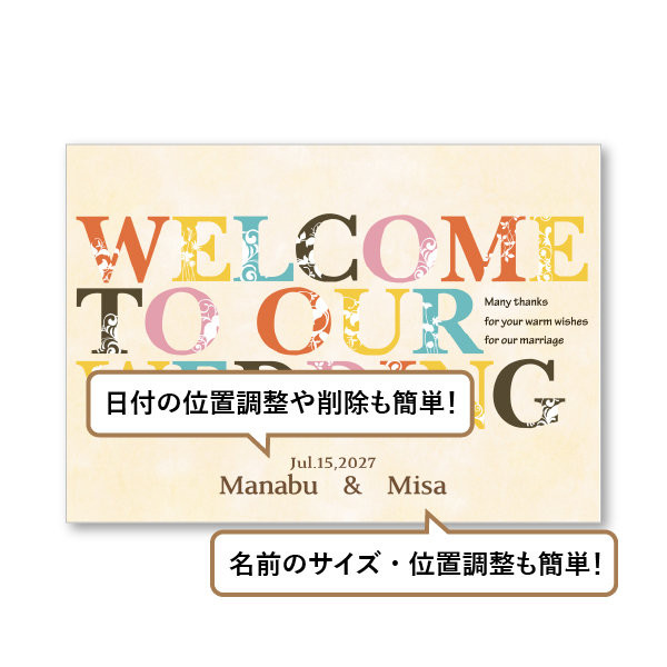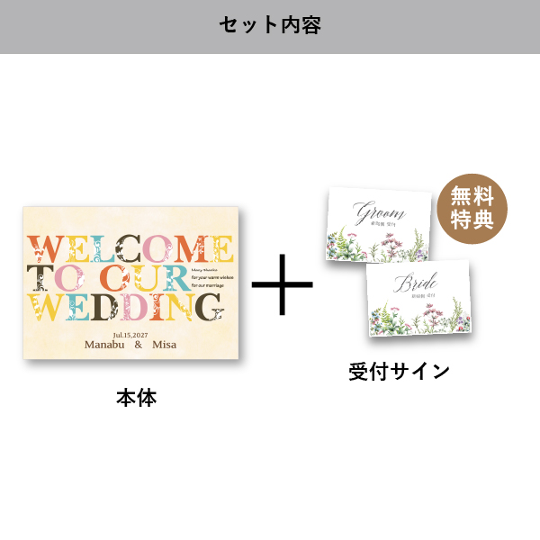 | 無料特典 | 受付サイン1組(新郎用×1組、新婦用×1組) |
