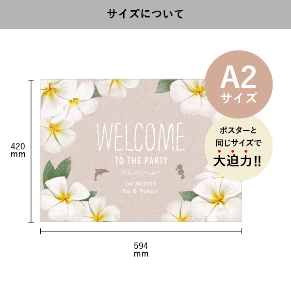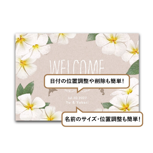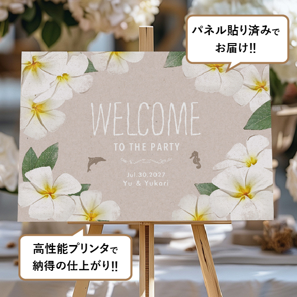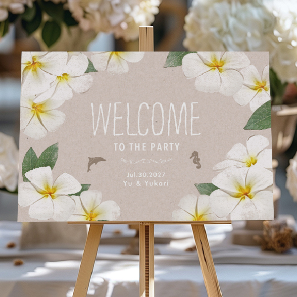 「神の宿る花」プルメリアをモチーフとしたデザイン。南国の海や白い砂浜をイメージさせるリゾートウェディングにぴったりの一枚です。リゾート気分を盛り上げてくれるウェルカムボードです。