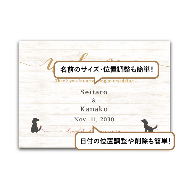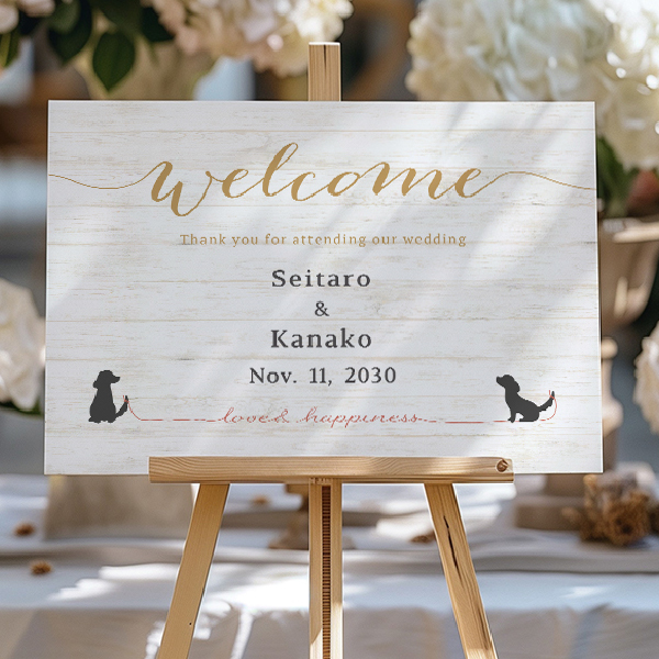 愛らしいワンちゃんのシルエットにおふたりの幸せを重ねて、赤い糸で「LOVE&HAPPINESS」を紡いでくれます。犬好きのおふたりにおすすめの一枚です。ナチュラル・カジュアルウェディングにぴったり!