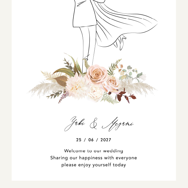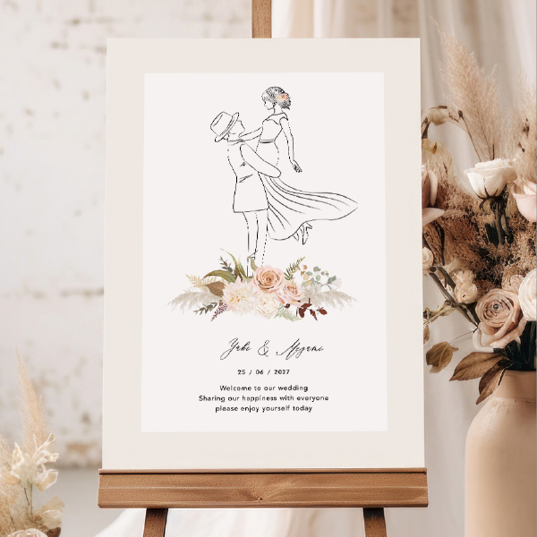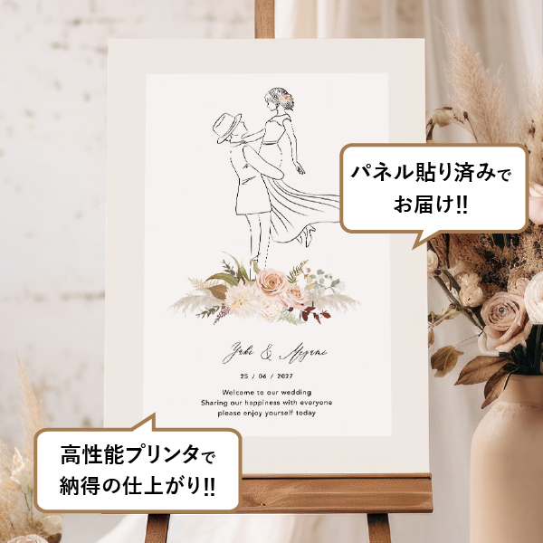 落ち着いたシックなフラワーにモノトーンデザインのイラストが大人かわいいウェルカムボード。