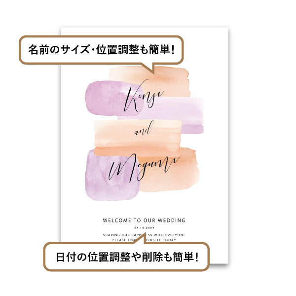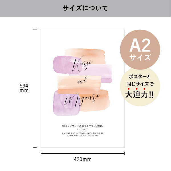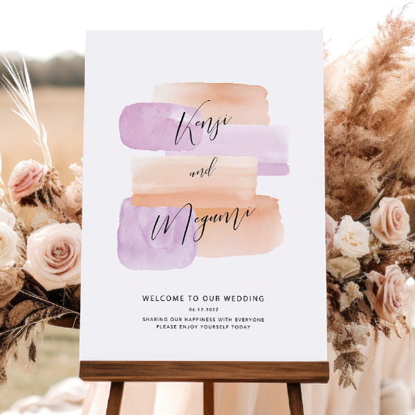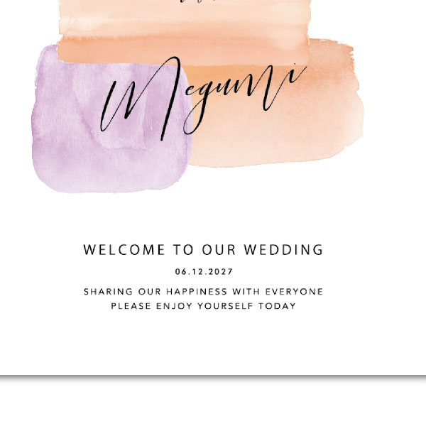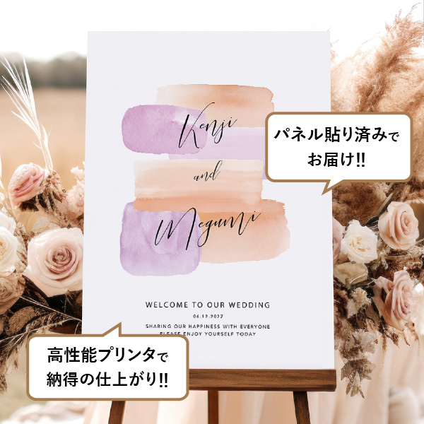 個性あふれるウェルカムスペースを演出したいあなたにピッタリの遊び心あふれるおしゃれなウェルカムボードです。パープル×オレンジ系のパステルカラーが目を引くデザインで、おしゃれなウェルカムスペースに。