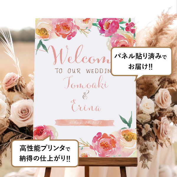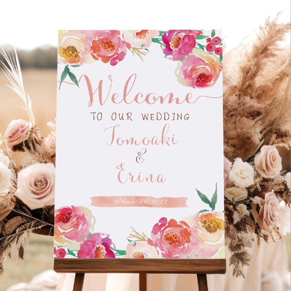 ウォーターカラーの色鮮やかなコーラルピンクのフラワーが印象的なウェルカムボードでゲストをお出迎え!エレガントでちょっぴり甘めな雰囲気を演出してくれます。ナチュラル・ガーデンウェディングにおすすめです。