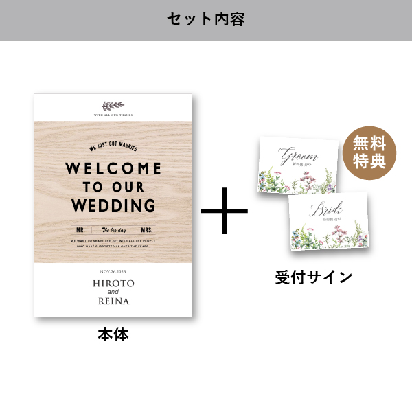 | 無料特典 | 受付サイン1組(新郎用×1組、新婦用×1組) |