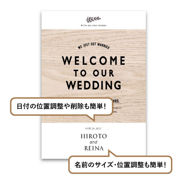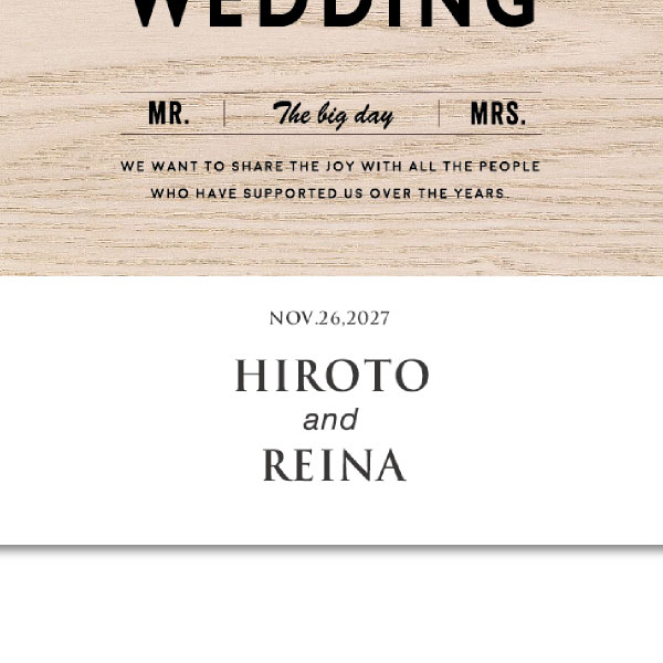 美しい木目調のデザイン、おふたりのこれまでの軌跡と今日という日を迎えられた喜びが溢れだす。大切な方たちと重ねてきた年月を、これからさらに深く刻んでいけますようにと、より一層の願いを込めて…。ナチュラル・カジュアル・ガーデンウェディングにおすすめです。