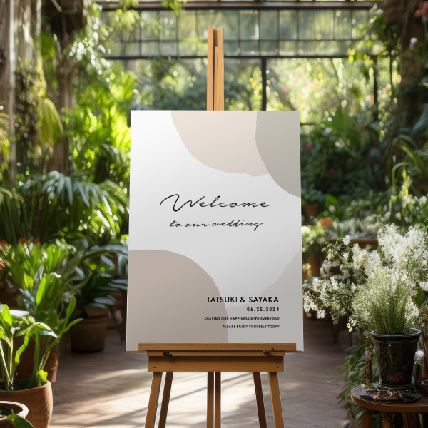 グレージュ系カモフラージュ柄のおしゃれなウェルカムボード。北欧デザインで揃えたい人やカジュアルウェディングにぴったりです。ウェルカムスペースをおしゃれに演出してくれます!