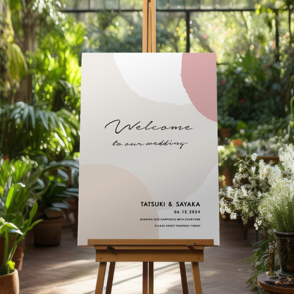 ピンク系カモフラージュ柄のおしゃれなウェルカムボード。北欧デザインで揃えたい人やカジュアルウェディングにぴったりです。可愛らしさとトレンド感を兼ね備えたウェルカムボードでゲストをお出迎え。