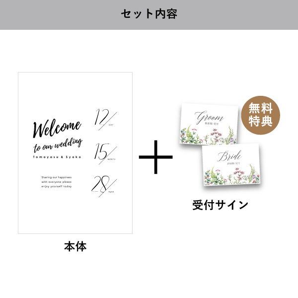 | 無料特典 | 受付サイン1組(新郎用×1組、新婦用×1組) |