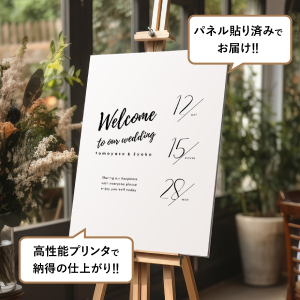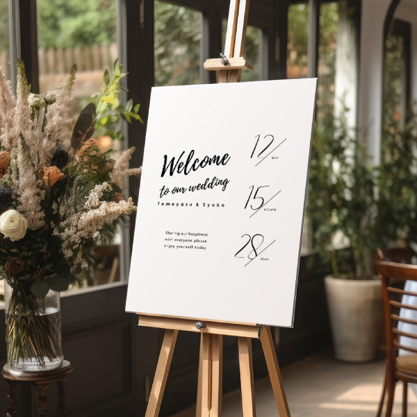 ふたりの記念すべき晴れの日をカリグラフィで演出。スタイリッシュなおふたりにおすすめ!シンプルでおしゃれなデザインは、どんなテイストにも溶け込むウェルカムボードです!
