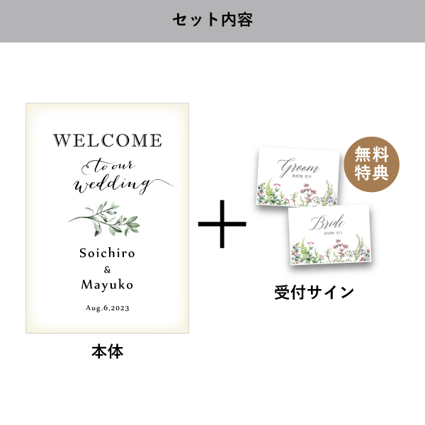 | 無料特典 | 受付サイン1組(新郎用×1組、新婦用×1組) |