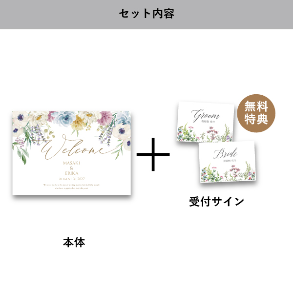 | 無料特典 | 受付サイン1組(新郎用×1組、新婦用×1組) |