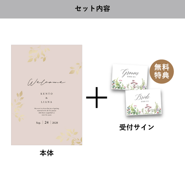 | 無料特典 | 受付サイン1組(新郎用×1組、新婦用×1組) |