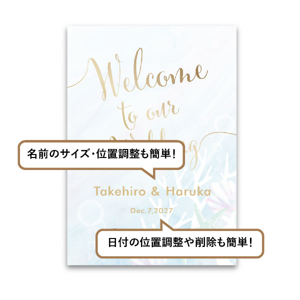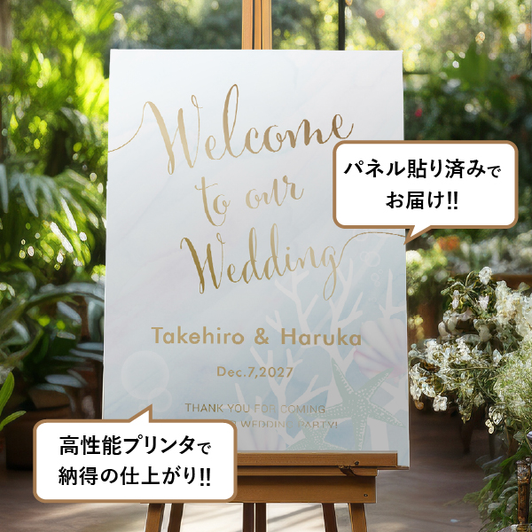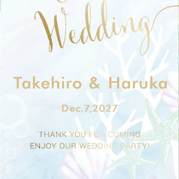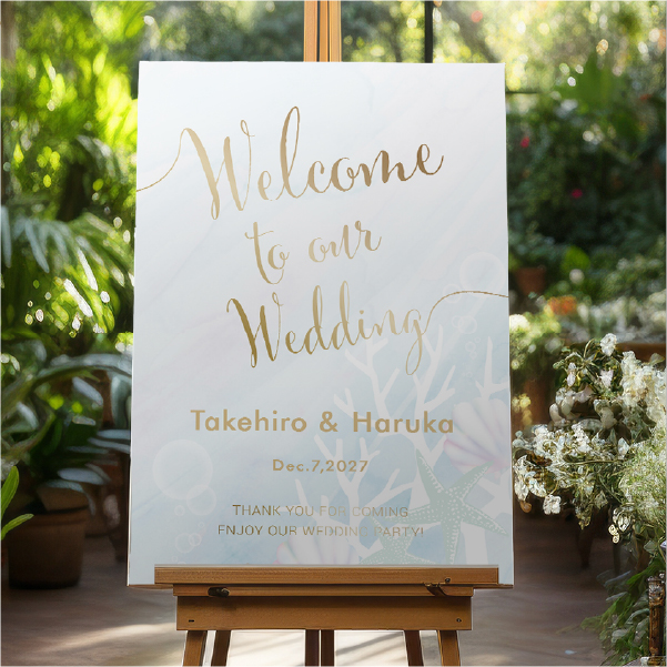 ブルーのグラデーションに淡く描かれた珊瑚。まるで海の中を連想させるマリンテイストのウェルカムボード。ゴールドの文字が上品さをプラスしサマーウェディングにぴったりな一枚です。
