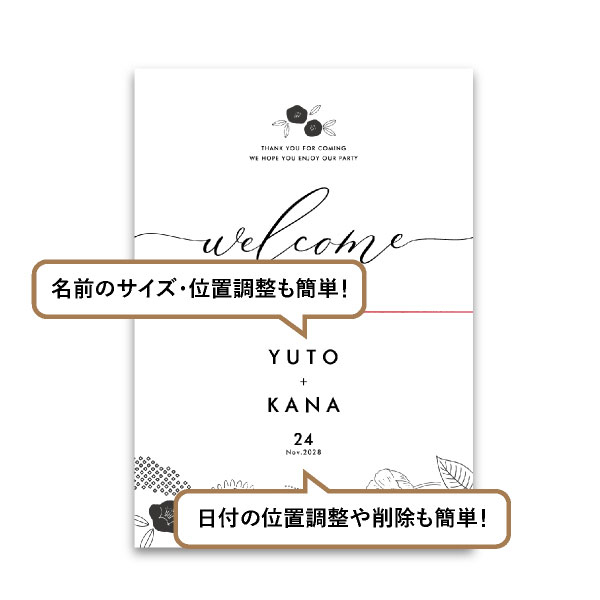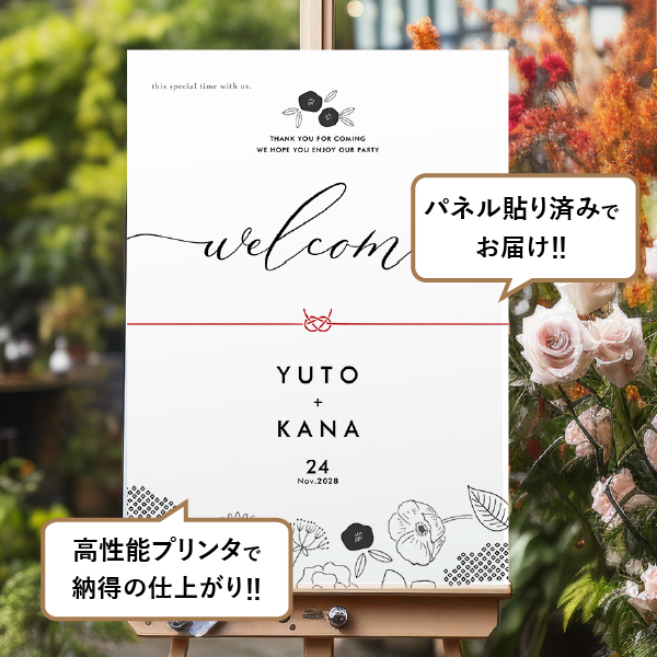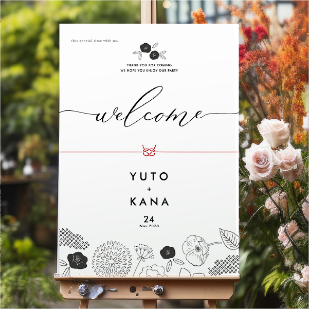 モノトーンの落ち着いた草花が印象的な個性派デザイン。和モダンを感じさせる大人ウェディングにぴったりな一枚。センスが光るウェルカムボードが、一味違う和ウェディングを演出してくれます!
