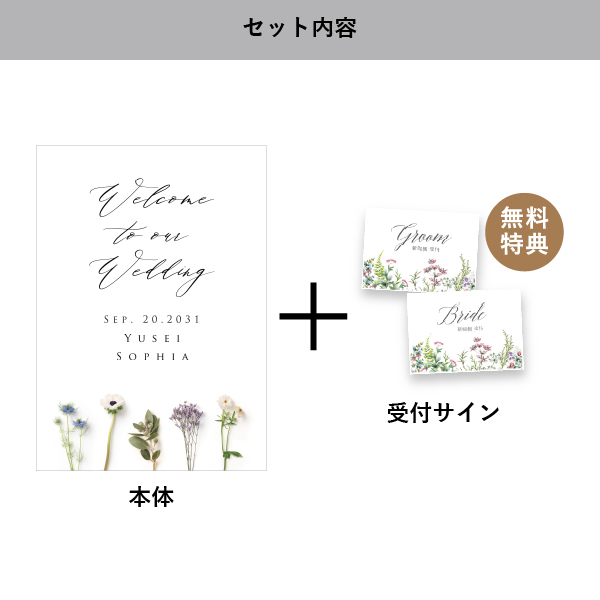 | 無料特典 | 受付サイン1組(新郎用×1組、新婦用×1組) |
